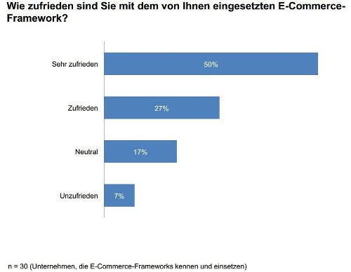Von den 30 Unternehmen, die bereits E-Commerce-Frameworks kennen und einsetzen, sind 77% mit ihrem Framework zufrieden (Bildquelle ibi Research).