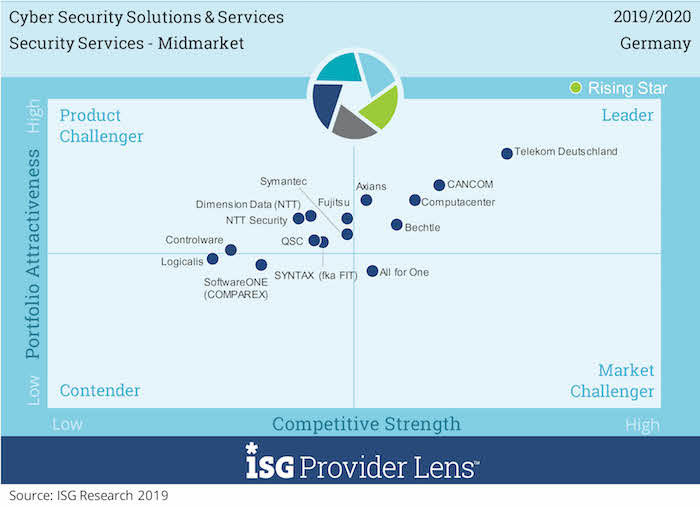 Der „ISG Provider Lens – Cyber Security Solutions & Services Germany 2019/2020“ untersuchte im Marktsegment „Security Services – Midmarket“ die Fähigkeiten von 15 Providern. Aktuelle Leader in diesem Markt sind Bechtle, CANCOM, Computacenter und Telekom Deutschland. Zudem ist Axians neu im Leader-Quadranten vertreten.