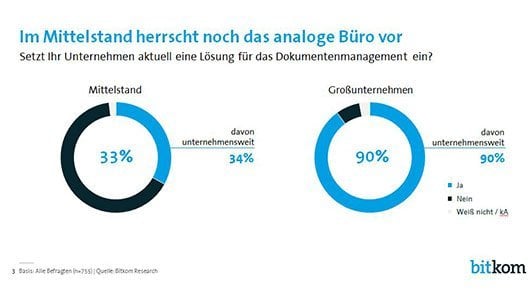 Aktuell herrscht im Mittelstand allerdings noch das analoge Büro vor. So nutzt gerade einmal jeder dritte Mittelständler (33 Prozent) eine digitale Dokumentenverwaltung etwa für die Archivierung, den Posteingang oder das Teilen von Informationen im Unternehmen. Bei den Großunternehmen mit 500 oder mehr Mitarbeitern sind es dagegen 90 Prozent. Und während von den Nutzern einer solchen Software im Mittelstand gerade einmal 34 Prozent ein unternehmensweites System eingeführt haben, setzen bei den Großen 9 von 10 (90 Prozent) auf eine einheitliche Lösung für das Unternehmen. „Im Mittelstand nutzen nur 11 Prozent der Unternehmen ein unternehmensweites ECM- oder DMS-System, bei den Großunternehmen sind es 81 Prozent“, sagt Biffar. „Man könnte auch sagen: Der Mittelstand hat einen hausgemachten Wettbewerbsnachteil gegenüber den Großen wenn es um die digitale Transformation geht. ,Digital first‘ muss nicht nur für das Angebot des Unternehmens auf dem Markt gelten, es muss das Leitmotiv des gesamten Unternehmens sein.“