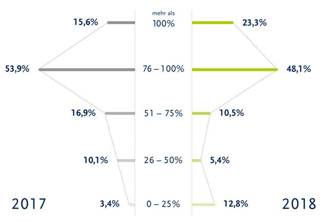 Zusammengenommen 71,4 Prozent hatten eine sehr gute Auslastung von über 76 Prozent im bisherigen Jahresverlauf, 1,9 Prozent mehr als im vergangenen Jahr. Fast jeder Vierte hatte sogar eine Auslastung von über 100 Prozent – ebenfalls ein deutlich höherer Wert. Etwa jeder Fünfte hatte im ersten Halbjahr eine Projektauslastung von unter 50 Prozent, das sind mehr als im Vergleich zu der Befragung im Vorjahr. Der Wert für eine sehr schwache Auslastung hat sich zudem fast vervierfacht.
