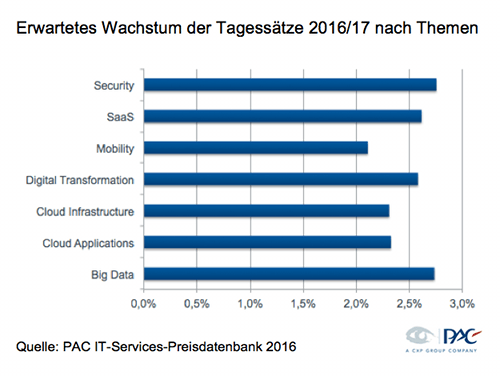 Die aktuellen Zahlen zeigen, dass Berater im Umfeld der sogenannten Hot Topics – Big Data, Cloud, Mobility, Security, Software as a Service (SaaS), Digital Transformation – stark gefragt sind. Das Preisniveau ist hier wie in den Vorjahren besonders hoch und steigt überdurchschnittlich an. Am deutlichsten ist der Preissteigerungseffekt im Bereich Security und Big Data zu spüren. Erwartungsgemäß steigen hier bei den spezialisierten und erfahrenen Beraterprofilen die Tagessätze auch im kommenden Jahr am stärksten an.