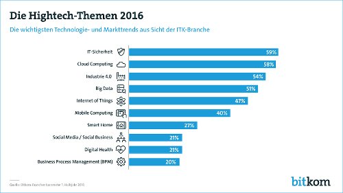Die wichtigsten Hightech-Themen und Trends des Jahres wurden im Rahmen der halbjährlich durchgeführten Konjunkturumfrage „Bitkom-Branchenbarometer“ erhoben. Dabei befragt Bitkom Research regelmäßig ITK-Unternehmen zur Marktentwicklung und ausgewählten Branchenthemen. Die Frage lautete: „Was sind aus Sicht Ihres Unternehmens die maßgeblichen Technologie- und Markttrends, die den deutschen ITK-Markt im Jahr 2016 prägen werden?“
