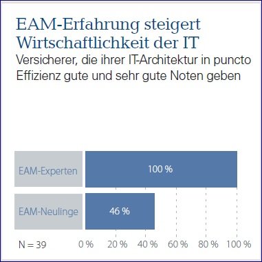 Ein fortgeschrittenes Enterprise Architecture Management steigert die Wirtschaftlichkeit der eingesetzten IT. Die Studie zeigt: Bei Assekuranzen mit EAM-Expertenstatus sind die IT-Verantwortlichen zu 100 Prozent mit der Effizienz ihrer Systeme zufrieden. Gleichzeitig erwarten acht von zehn CIOs aus Häusern mit hohem EAM-Reifegradeine deutlich über dem Branchenschnitt liegende wirtschaftliche Entwicklung ihres Unternehmens. Bei IT-Managern, die bisher in Sachen Enterprise Architecture Management (EAM) nichts oder nur sehr wenig unternommen haben, verteilt dagegen nur rund jeder zweite Bestnoten für die Wirtschaftlichkeit der IT-Architektur.