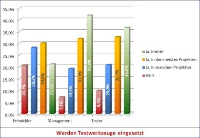 Während fast die Hälfte der Entwickler angab, dass die Testaktivitäten keinem definierten Prozess folgen, war dies bei nur 19 Prozent der Tester der Fall. Fragt man die Teilnehmer nach dem eingesetzten Verfahren für den dynamischen Test, so wird der werkzeuggestützte Test nur zu 40 Prozent bei den agilen und zu 31 Prozent bei den phasenorientierten Projekten eingesetzt. Beim Einsatz von Testwerkzeugen gibt es kaum einen Unterschied zwischen den Branchen, jedoch setzen die Entwickler signifikant weniger (51 Prozent) Testwerkzeuge ein als die Tester (70 Prozent). Bei den agilen Projekten ist der Anteil der Entwickler, die Testwerkzeuge benutzen, höher (71 Prozent). Da Test Driven Development eine essentielle Praktik im Agilen Umfeld darstellt, wurde hier jedoch ein noch höheres Ergebnis erwartet.