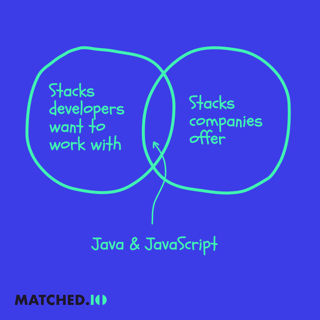 Während viele Unternehmen und Entwickler:innen in Deutschland sowohl Java als auch JavaScript als gemeinsamen Nenner finden, geht die Schere bei Python zum Beispiel auseinander. Entwickler:innen stellen fest, dass es verhältnismäßig wenig Python Umgebungen bzw. Produkt-Teams in Deutschland gibt – lediglich 7,5% der auf matched.io registrierten Unternehmen arbeiten mit Python. Jedoch ist die Nachfrage auf der Entwickler:innen-Seite groß – über 16% der auf matched.io registrierten Entwickler:innen, und somit Platz 3 auf deren Wunsch-Tech-Stack Liste, würden gerne mit Python arbeiten.