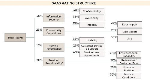 Bild: Das ASCAMSO-SaaS-Rating-Modell mit Haupt- und Unterkriterien einschl. unserer Standard-Gewichtung (d.h. Bedeutung für ein Rating auf App.Ascamso.com)