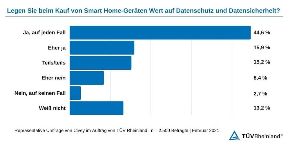 „Gründe, warum Smart Home-Geräte in Deutschland nicht noch mehr als bisher verbreitet sind, sind auch die möglichen Risiken und die damit verbundene Frage nach dem Datenschutz sowie der Datensicherheit“, sagt Tobias Hollmann, Smart Home-Experte von TÜV Rheinland. Dies bestätigt auch eine aktuelle Umfrage des Meinungsforschungsinstituts Civey zum Thema Datenschutz und Datensicherheit beim Kauf von Smart Home-Geräten. Die Umfrage zeigt, dass 60,5 Prozent der Befragten beim Kauf solcher Geräte Wert auf Datenschutz und Datensicherheit legen. Davon stimmten 15,9 Prozent mit „eher ja“, und sogar 44,6 Prozent äußerten, dass sie auf Datenschutz und -sicherheit „in jedem Fall“ bei der Anschaffung Wert legen. 13,2 Prozent der Befragten waren unentschieden und antworteten auf die Frage nach Datenschutz und -sicherheit beim Kauf von Smart Home-Geräten mit „Weiß nicht“ und nur 11,1 Prozent der Befragten legen beim Kauf von smarten Geräten eher keinen Wert (8,4 Prozent der Befragten) oder gar keinen Wert (2,7 Prozent der Befragten) auf beide Punkte. Die Ergebnisse stammen aus einer repräsentativen, von TÜV Rheinland beauftragten Civey-Umfrage vom Februar 2021 unter rund 2.500 Befragten.