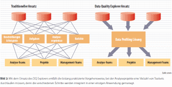 Mit dem Einsatz des DQ Explorers entfällt die bislang praktizierte Vorgehensweise, bei der Analyseprojekte eine Vielzahl von Toolsets durchlaufen müssen, denn die verschiedenen Schritte werden integriert in einer einzigen Anwendung gemanagt. Dabei ermitteln die Anwender mit einer intuitiv gestalteten Oberfläche imRahmen einer automatisierten Quelldatenanalyse den Ist-Zustand der Daten sowie bestehende Fehler, Anomalien und Inkonsistenzen. Dies kann vor einer Überführung in andere Systeme, im Rahmen von Compliance- und BI-Initiativen oder auch bei Migrations-, Balanced-Scorecard- oder Data-Warehouse-Projekten geschehen. Das Profiling-Tool liefert automatisch für jedes Attribut Informationen wie beispielsweise Werte und Muster sowie deren Häufigkeit, Anteil Null-Werte, Anteil eindeutiger Werte, Minimum und Maximum, abgeleiteter Datentyp oder auch Verdacht auf Ausreißer. Auffällige und problematische Werte können umgehend erkannt und die betroffenen Datensätze per Mausklick angezeigt werden; auch Join-Prüfungen zwischen Tabellen aus unterschiedlichen Datenquellen sind möglich. Im Ergebnis lässt sich so eine Zeitersparnis von bis zu 90 Prozent im Vergleich zu herkömmlichenMethoden erzielen.