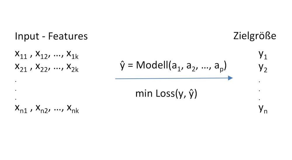 Bild 1: Ein Prognosemodell ist eine Zuordnung der Input-Daten – auch Features genannt – auf eine oder mehrere Zielgrößen. Im diesem Fall liegen k unterschiedliche Features, n unterschiedliche Beobachtungen in den historischen Daten und p unterschiedliche Modellparameter vor. In der Lernphase werden die Modellparameter a1, …, ap so festgelegt, dass eine sogenannte Loss-Funktion optimiert wird. Eine mögliche Loss-Funktion misst beispielsweise die Summe der Abstände zwischen den tatsächlichen Werten der Zielgröße aus den historischen und den prognostizierten Daten. (Quelle: CGI)