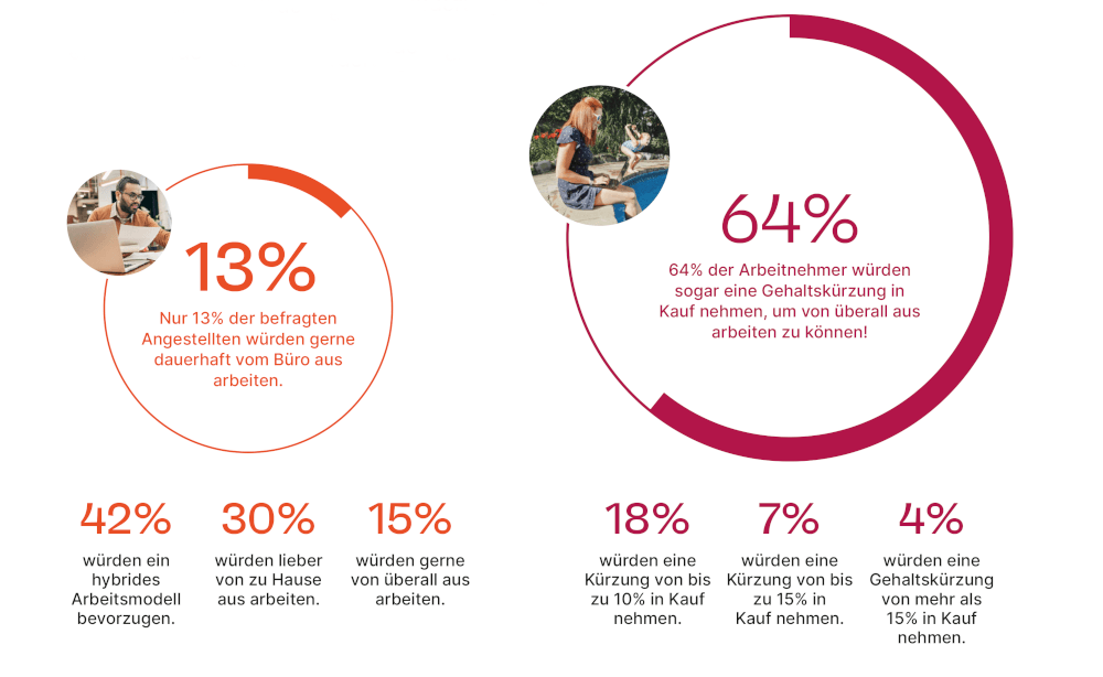 Zwei Jahre Pandemie haben die Arbeitswelt transformiert. Der Erfolg des Experiments „Home Office“ macht eine Rückkehr in Vollzeitbüros zunehmend unwahrscheinlich. Gerade einmal 13 % der deutschen Befragten wünschen sich die Rückkehr an den festen Arbeitsplatz. Home Office, hybride Arbeitsplatzkonzepte oder selbst die Arbeit von jedem Ort aus – Stichwort „Digitale Nomaden“ – liegen in der Gunst der Deutschen vor dem klassischen Schreibtisch in der Firma. 73 % der Befragten gaben zudem an, dass sie lieber ihren Arbeitsort frei wählen würden, als eine Beförderung zu erhalten.