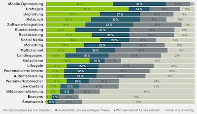 Handel und Touristik sind die Branchen, die schon am weitesten sind, wenn es darum geht, relevante E-Mails zu versenden. Customer Experience ist aktuell wichtigstes Thema im Handel: Sechzig Prozent der Befragten sind hier aktiv. An Lifecycle-Kampagnen arbeitet jeder zweite Händler. Im Vergleich mit den anderen Branchen haben im Handel bei fast allen Themen über die Hälfte die Antwortoptionen „Ist schon länger bei uns Standard“ oder „Ist aktuell für uns ein wichtiges Thema“ angekreuzt. Bei Krankenversicherungen sind das nur drei Themen.