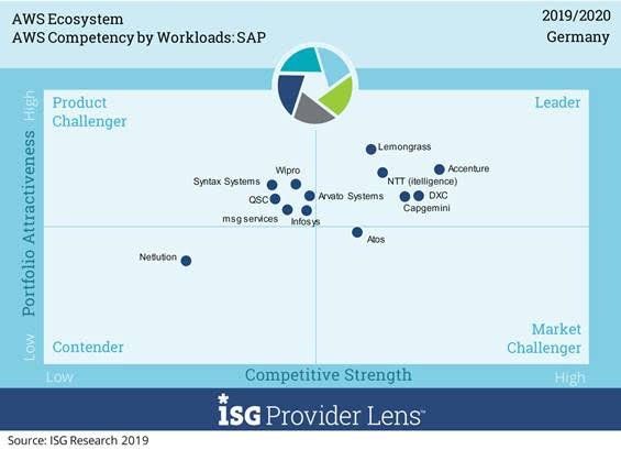 Im Marktsegment „AWS Competency by Workloads: SAP“ ermittelt die Studie insgesamt 13 Anbieter, die sich in puncto Wettbewerbsstärke und Portfolioattraktivität von der Konkurrenz abheben. Fünf dieser Anbieter konnten sich als Leader positionieren. Vier davon – Accenture, DXC, Capgemini und NTT (itelligence) – weisen bereits seit Jahren eine erhebliche Stärke im deutschen SAP-Markt auf. Dank ihrer Umsetzungskompetenz im SAP-Umfeld haben sich diese Dienstleister nun auch im Public-Cloud-Bereich eine starke Marktstellung erarbeitet. Der fünfte Leader im SAP-Segment ist das erst 2008 gegründete englische Unternehmen Lemongrass, das international bereits zu den führenden Anbietern von SAP-Lösungen in der AWS-Cloud zählt. Laut Studie habe das Unternehmen nun auch in Deutschland ausreichende Strukturen aufgebaut, um den Markt nachhaltig zu erschließen.