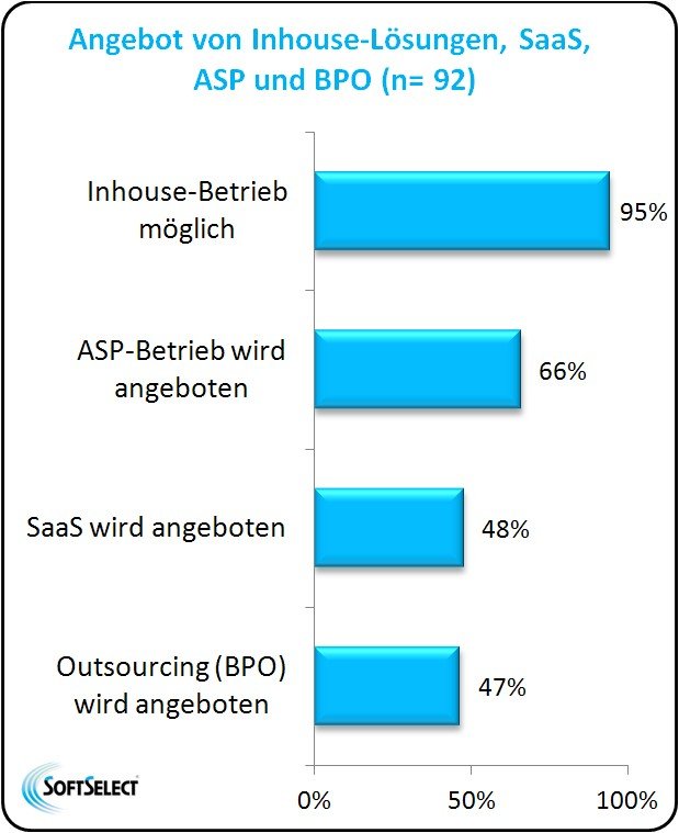 Im ERP-Bereich ist der Anteil an SaaS-fähigen Lösungen im Vergleich zu anderen Softwarebereichen unterrepräsentiert. Gerade einmal 48 Prozent der untersuchten ERP-Lösungen werden als Mietmodell über SaaS angeboten. Application Service Providing (ASP) ist bereits seit Jahren im ERP-Segment ein beliebtes Vertriebsmodell und ist bei zwei Dritteln der ERP-Anbieter zu beziehen. Zum Vergleich: Im Bereich von Personalwesen-Software (Human Resource Management) liegen die Anteile mit 67 Prozent für SaaS und 80 Prozent für ASP deutlich höher.