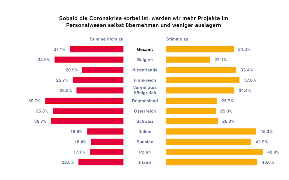 40 Prozent der deutschen Unternehmen wollen nach der Corona-Pandemie weiterhin auf das Outsourcing von HR-Aufgaben setzen. Innerhalb Europas fällt die Entscheidung dazu jedoch sehr unterschiedlich aus. Während auch in der Schweiz (37 Prozent), Österreich (36 Prozent) und Belgien (35 Prozent) rund vier von zehn Unternehmen ihre Personalarbeit an externe Partner übergeben wollen, planen dies in Polen (17 Prozent), Irland (23 Prozent), Italien (19 Prozent) und Spanien (16 Prozent) nur zwei von zehn Unternehmen.