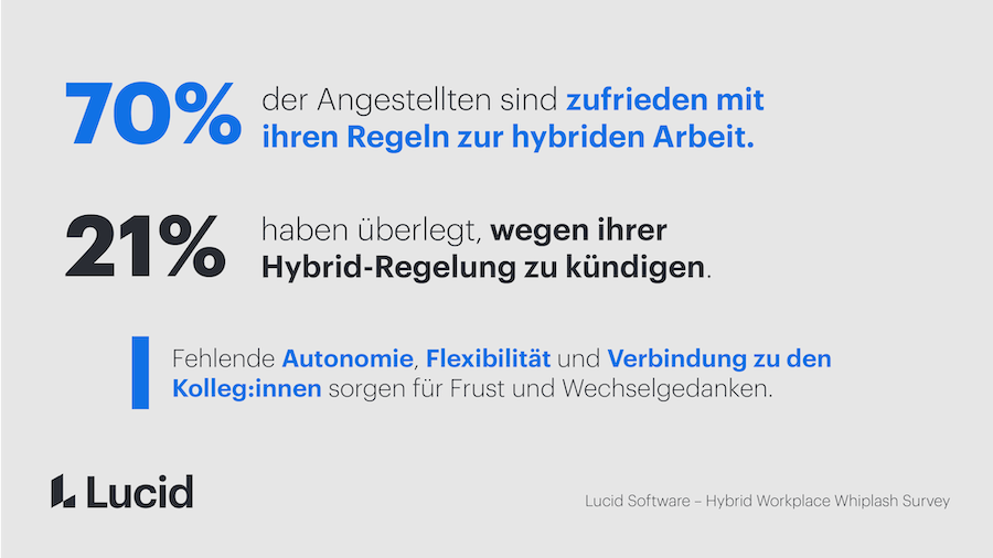 Dies zeigen die Ergebnisse der Hybrid Workplace Whiplash Survey von Lucid Software. Im Rahmen der Befragung wurden Wissensarbeitende in fünf Ländern zu den Richtlinien, Wünschen und Bedürfnissen rund um hybrides Arbeiten befragt.