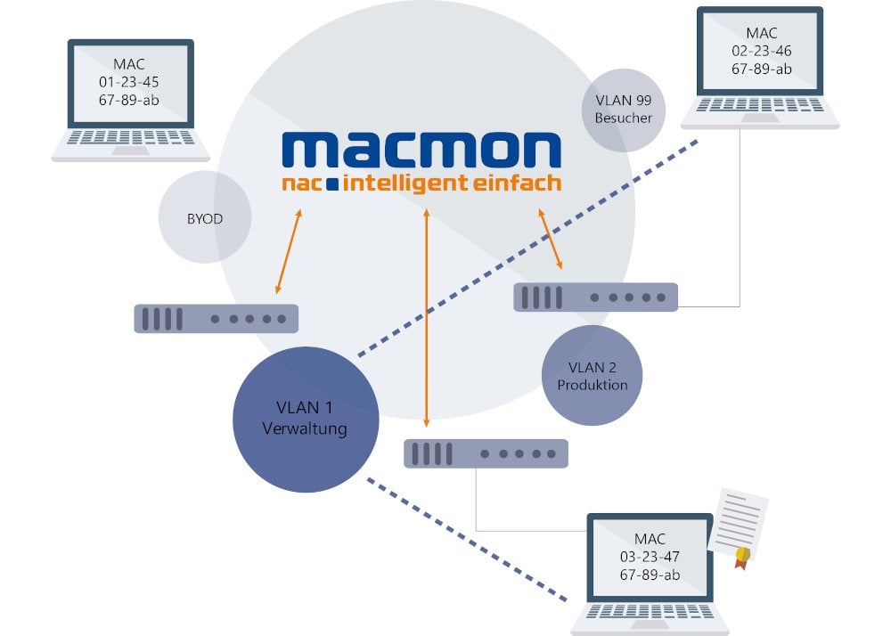 Um heutige Netzwerke vollständig kontrollieren zu können, muss eine NAC-Lösung auch jede Authentifizierungstechnologie unterstützen. Nicht alle Anbieter stellen diese Möglichkeit bereit oder ermöglichen die Arbeit auch im gemischten Betrieb mit Technologien wie 802.1X und SNMP. macmon NAC bildet dies nicht nur ab, sondern skaliert mit dem Netzwerk. Die bestehende Infrastruktur, die Kommune betreibt ihr Rechenzentrum mit Endgeräten diverser Hersteller und virtuellen Servern von VMware, kann einfach weiter verwendet werden, wie sie ist. Bei Änderungen sorgen das Regelwerk, Automatismen und Abläufe im Hintergrund dafür, dass keinerlei zusätzlichen Maßnahmen erforderlich sind. Das ist gerade im Behördenumfeld ein großer Vorteil, da sich hier Verwaltungsbezirke und Organisationsstrukturen nach einer Legislaturperiode oft ändern können.