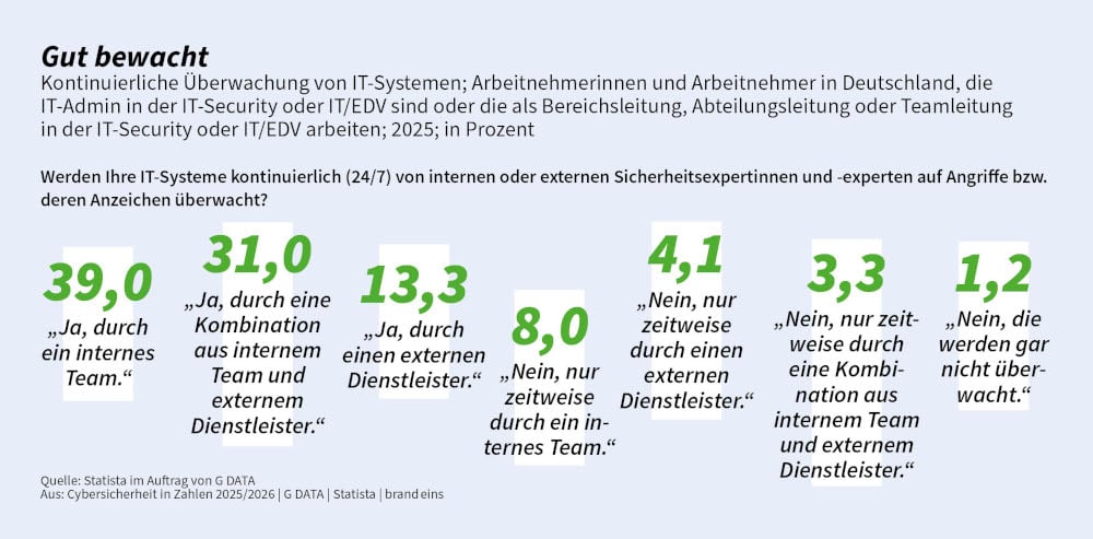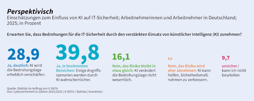 Wie steht es um die IT-Sicherheit in Deutschland? Antworten liefert die aktuelle Studie „Cybersicherheit in Zahlen“, durchgeführt von G DATA CyberDefense, Statista und brand eins. Die fünfte Ausgabe zeigt: Künstliche Intelligenz macht Cyberangriffe raffinierter. Und viele Unternehmen sind darauf noch unzureichend vorbereitet.