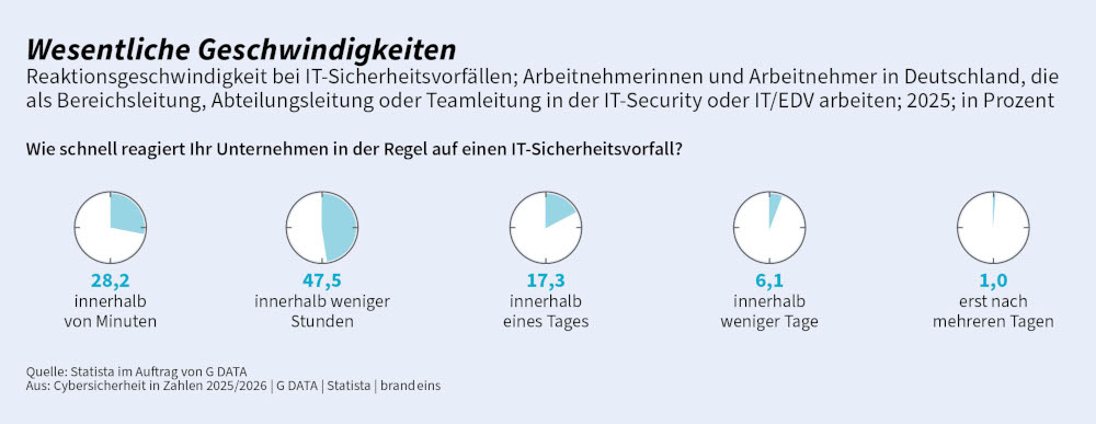 Wenn der IT-Schutz in Unternehmen unvollständig oder nicht dem aktuellen Stand entspricht, haben Cyberkriminelle leichtes Spiel. Dann verwundert es nicht, dass Firmen einer Cyberattacke zum Opfer fallen. Mehr als 30 Prozent der Befragten berichten von mindestens einer Cyberattacke im vergangenen Jahr. In 10 Prozent der Fälle waren es sogar mehrere Vorfälle. Die Folgen reichten von Betriebsausfällen (32 Prozent) über Datenverlust (29 Prozent) und finanzielle Schäden (20 Prozent) bis hin zu DSGVO-Strafen (10 Prozent). Erschwerend kommt hinzu, dass viele Unternehmen nicht schnell genug reagieren: Nur 28 Prozent leiten innerhalb von Minuten Gegenmaßnahmen ein. Jeder vierte Fall zeigt Reaktionszeiten von einem Tag oder mehr – ein kritisches Zeitfenster, in dem Schäden in die Höhe schnellen – sowohl die Ausfallzeiten als auch die Kosten zum Beheben.