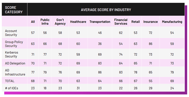 - Organisationen erzielten in fünf Active Directory-Sicherheitskategorien insgesamt durchschnittlich 68 %; AD-Delegierung, Kontosicherheit, AD-Infrastruktursicherheit, Gruppenrichtliniensicherheit und Kerberos-Sicherheit. Das ist kaum bestanden.