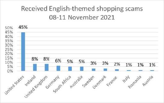 Bild 3: Herkunft der Shopping-Scam-Mails vom 8. bis zum 11. November 2021. (Bildquelle: Bitdefender)