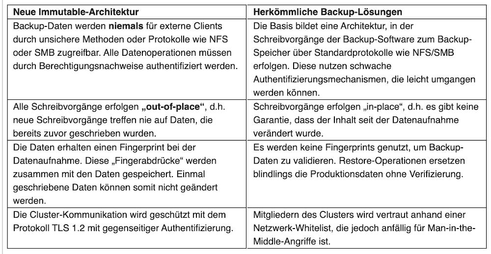 Während primäre Speichersysteme offen und für Clientsysteme verfügbar sein müssen, sollten Backup-Daten unveränderbar sein. Das bedeutet, dass einmal geschriebene Daten von den Clients im Netzwerk nicht mehr geändert oder gelöscht werden können. Dies ist die einzige Möglichkeit, die Wiederherstellung sicherzustellen, wenn die Produktionssysteme kompromittiert werden. Dies geht weit über einfache Dateiberechtigungen, Ordner-ACLs oder Speicherprotokolle hinaus. Das Konzept der Unveränderbarkeit muss in die Backup-Architektur „eingebacken“ werden, damit die Backups nicht manipuliert werden können.
