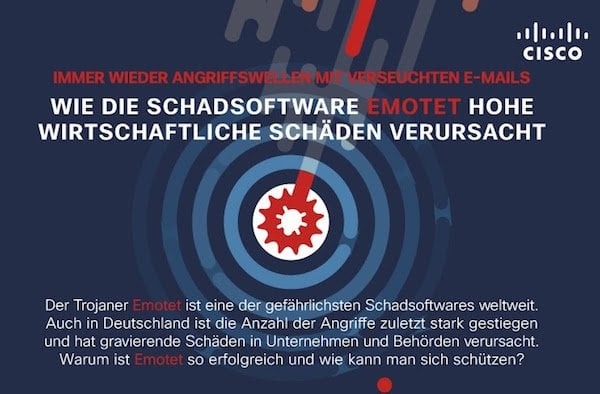 Emotet ist ein Trojaner, der typischerweise über Spam-E-Mails verbreitet wird. Ausgehend von gehackten E-Mail-Konten fingiert Emotet E-Mails mit Betreff, Anrede und Signatur, die an vorherige Nachrichten anknüpfen. „Besonders problematisch an Emotet ist, dass diese Spam-Mails sehr authentisch aussehen. Sie scheinen von Freunden, Nachbarn oder Kollegen zu kommen und beziehen sich auf vorherige Nachrichten. Schädliche Dateianhänge oder URLs werden daher unbedacht geöffnet und das Gerät infiziert“, erklärt Holger Unterbrink, Security Researcher, Cisco Talos Threat Intelligence.