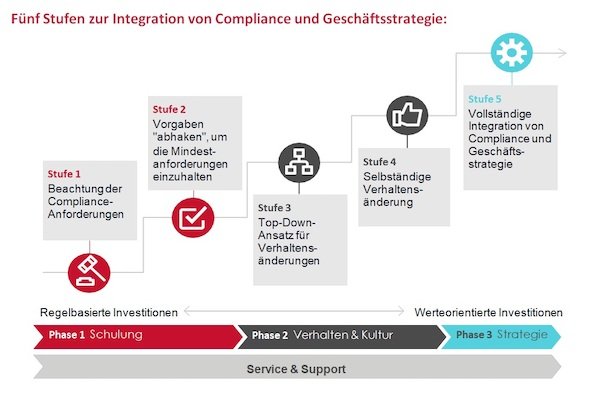 Im Idealfall entwickeln sich Compliance-Schulungen in einem Unternehmen von einer anfänglichen Zielsetzung für mehr Compliance-Bewusstsein über einen mittelfristigen auf Verhalten und Kultur gerichteten Fokus bis hin zur Reife, bei der die Lernerfahrung im Bereich Compliance zu einem vollständig integrierten Bestandteil der Geschäftsstrategie wird. Bei dieser Entwicklung verschiebt sich auch die werteorientierte Basis der Compliance-Investitionen vom der Vermeidung negativer Auswirkungen, die eine Nichteinhaltung haben würde, hin zu einer Kultur der Compliance, die einen umfassenderen Geschäftsnutzen ermöglicht: das Unternehmen etabliert sich als bevorzugter Partner für Kooperationen, die Marke wird positiv wahrgenommen, Top-Talente sind am Unternehmen interessiert, die Wettbewerbsfähigkeit und die Mitarbeiterbindung werden verbessert.