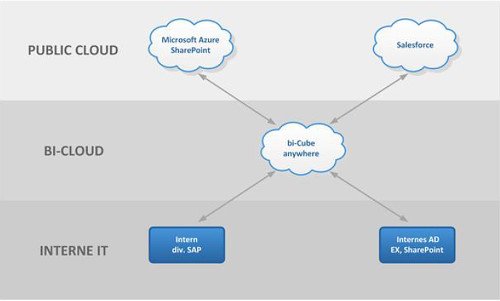 Dabei werden aus der Cloud heraus die User und deren Berechtigungen automatisch in den Anwendungen innerhalb der IT des Anwenders verwaltet. Zusätzlich muß der Entwicklung Rechnung getragen werden, dass die Kunden zunehmend weitere Cloud-Services in Nutzung nehmen. Mit bi-Cube werden auch diese Dienste automatisch in den Lebens-Zyklus eines Users im Unternehmen mit eingebunden. Damit wird vor allem sicher gestellt, dass ausgetretene Mitarbeiter im Rahmen des Austrittsprozesses auch diese Berechtigungen geordnet verlieren.