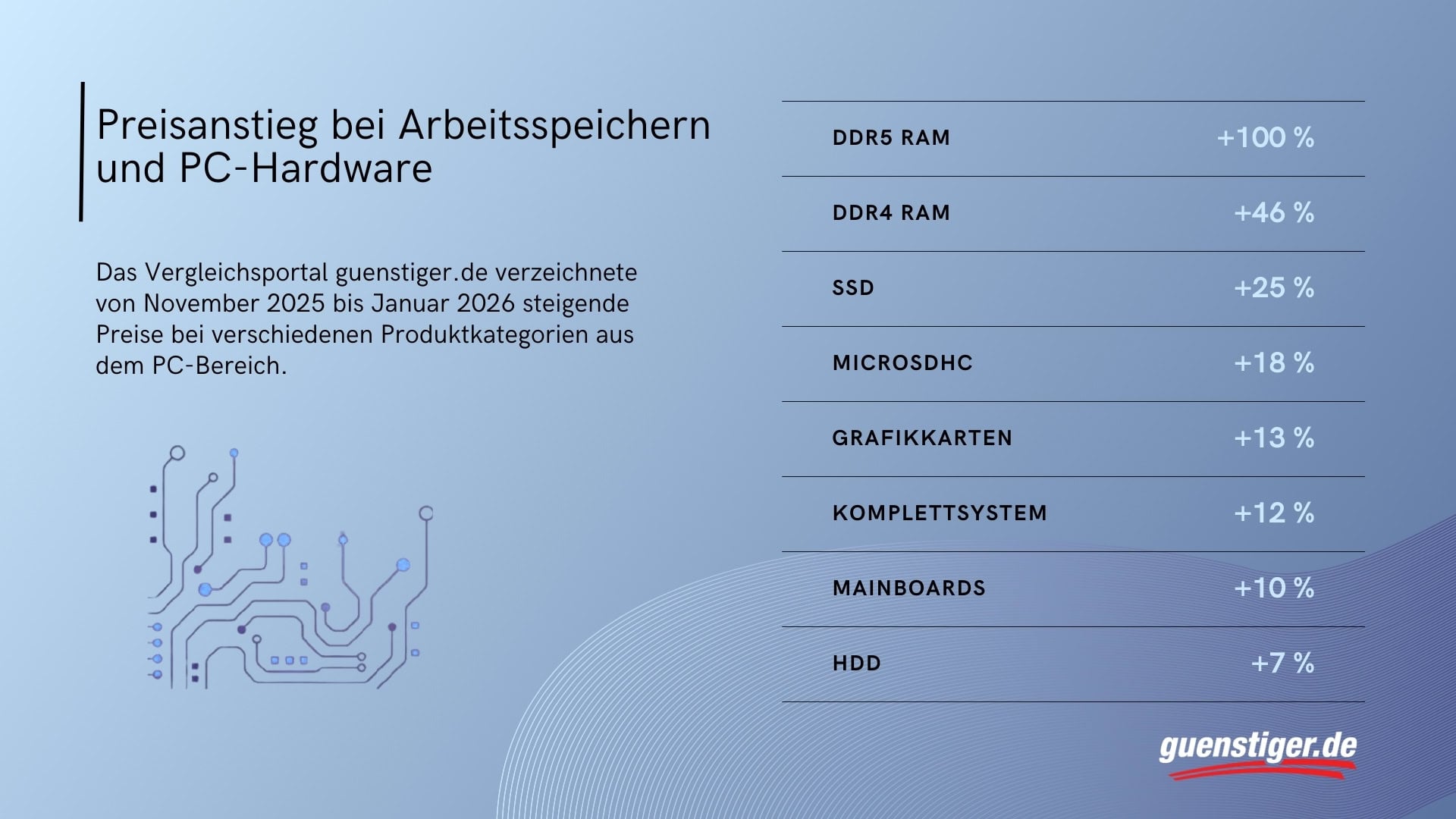 Torben Mallwitz, CTO von guenstiger.de, bringt es auf den Punkt: „Wer aktuell einen neuen PC zusammenstellt oder aufrüsten möchte, muss mit deutlich höheren Ausgaben rechnen“, erklärt er. „KI-Rechenzentren beanspruchen einen Großteil der weltweiten Speicherchip-Produktion, was dazu führt, dass weniger Kapazität für normale Consumer-Produkte wie DDR5-Module übrigbleibt und die Preise in die Höhe treibt.“