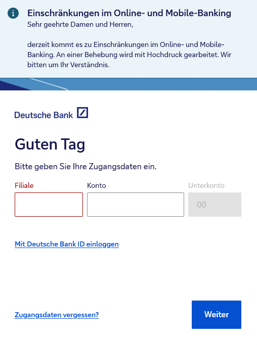 Update, Dienstag 10.47 Uhr: Die technischen Probleme bei den Banken des Deutsche-Bank-Konzerns dauern offenbar an bzw. sind nach dem Fix am Montagabend erneut aufgetreten. Am Dienstagmorgen meldeten sich erneut tausende Kunden auf den Störungsplattformen. Laut Allestörungen.de gingen um 10:25 Uhr bereits rund 4000 Meldungen zur Postbank ein, bei der Deutschen Bank waren es fast 1000. Laut den Reaktionen auf Social Media scheint das Problem abermals den Login-Bereich zu betreffen.