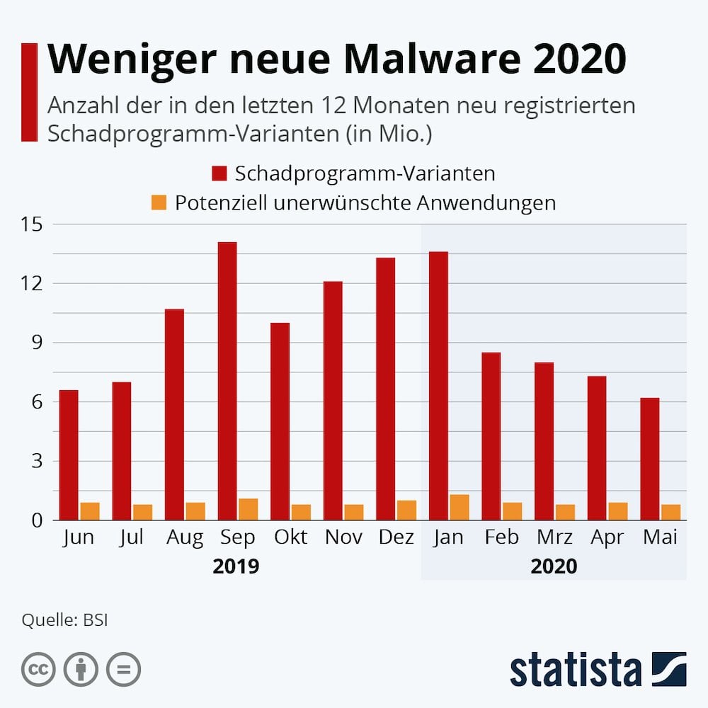 Die Anzahl der neu registrierten Schadprogramme hat im Frühjahr 2020 deutlich abgenommen. Laut aktuellem Lagebericht des BSI zur IT-Sicherheit in Deutschland, hat die Anzahl der Malware-Varianten im Januar noch bei knapp 14 Millionen gelegen, ehe die Welle im Februar eingebrochen ist und sich auf einem unterdurchschnittlichen Niveau verfestigt hat.