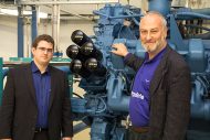 Lars Göbel (li.), Leiter Vertrieb und IT Services beim DARZ, erklärt Engelbert Hörmannsdorfer von speicherguide.de das Notstromaggregat (Bild: speicherguide.de)Ein Datacenter in dem ehemaligen Tresorgebäude der Hessischen Landeszentralbank – das ist die Besonderheit des DARZ (Darmstädter Rechenzentrum), und damit will das Unternehmen den Cloud- und Datacenter-Markt aufrollen. Vor allem bedeutet diese Lokation, dass dieses Gebäude hochsicher gebaut wurde. Bauliche Besonderheiten sind beispielsweise explosions- und schusssichere Verglasung sowie zwei Meter dicke Wände.