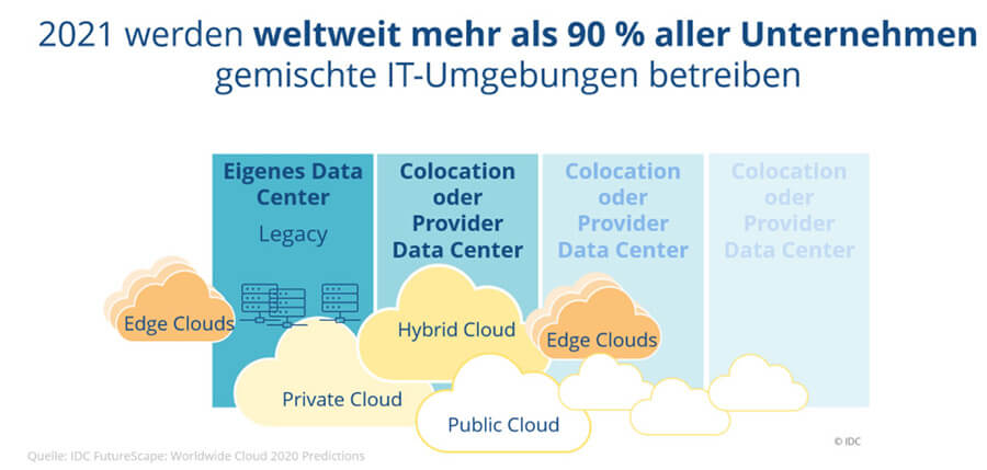 Laut IDC habe nicht zuletzt Covid-19 deutlich gemacht, dass Transparenz, Flexibilität und Agilität ohne die Cloud auch in deutschen Unternehmen kaum mehr vorstellbar sind. Sie sei ein zentraler Baustein der Widerstandsfähigkeit von Unternehmen. Die marktforscher prognostiziert deshalb, dass 2021 weltweit mehr als 90 Prozent aller Unternehmen gemischte IT-Umgebungen betreiben werden.