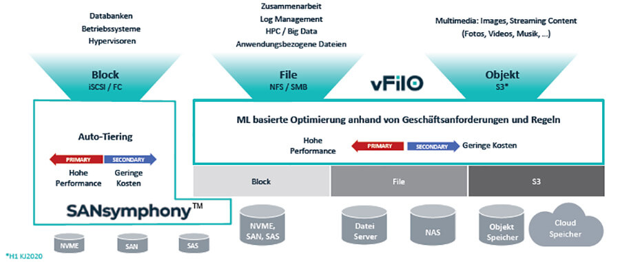 SANsymphony adressiert als Block-SDS vor allem strukturierten Unternehmensdaten. vFiLO steht für »Virtual File & Object« und ist SDS für File und Object. Es kann in Kombination mit Sansymphony eingesetzt werden, muss aber nicht.