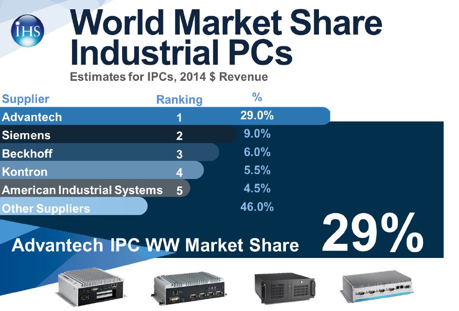 Advantech ist mit Abstand Marktführer im Bereich Industrie-PCs (Bild/Quelle: Advantech/IHS)Im Bereich Embedded-Computing bzw. Industriecomputer ist das taiwanische Unternehmen Advantech eine Macht. 1,3 Milliarden US-Dollar setzte man hier im letzten Jahr um, und mit 29 Prozent Marktanteil darf sich Advantech als unangefochtener Marktführer bei Industriecomputer (IPC – Industrial PCs) betrachten. Mit dem Know-how aus der Embedded-Computing-Szene will man nun auch den klassischen IT-Markt erobern.