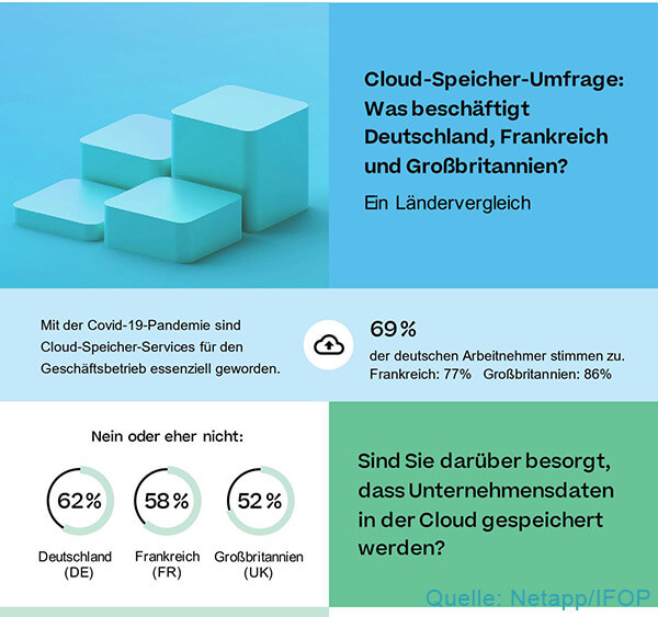 Wie Mitarbeiter den Einsatz von Cloud-Speichern anwenden und bewerten, analysiert eine länderübergreifende Nutzerstudie von Netapp und den Marktforschern von Ifop. Für IT-Profis sind die Ergebnisse wenig überraschend: Deutsche Mitarbeiter haben wenig Bedenken Unternehmensdaten in der Cloud zu speichern, auch im Vergleich zu französischen und britischen Befragten. Für IT-Abteilungen und Unternehmen sollte die Studie daher eine Aufforderung sein, mit Aufklärung gegen diese Sorglosigkeit anzugehen.