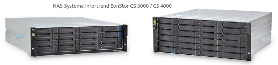 Die NAS-Systeme der »EonStor CS«-Serie von Infortrend sind in vier Modellen mit jeweils 16 bzw. 24 Einschüben erhältlich. Die Speicher lassen sich mit Erweiterungseinheiten sowohl ausbauen, als auch kombinieren (Scale-up/Scale-out) und als Storage-Cluster einsetzen. Über eine Parallelverarbeitung von Arbeitslasten (Re-Balancing) sollen Kapazität und Performance flexibel an die Bedürfnisse angepasst werden.