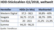 HDD-Marktzahlen Q1/2018 (Quelle: Trendfocus)HDD-Marktzahlen Q1/2018 (Quelle: Trendfocus)Laut einem vorläufigen Bericht von Trendfocus hat die Festplatten-Branche weltweit 94 Millionen bis 96 Millionen HDDs im ersten Quartal 2018 ausgeliefert. Das ist ein Rückgang in allen Belangen: Dass die Shipments niedriger ausfallen würden, als im traditionell stärkeren vierten Quartal war vorhersehbar, aber der Abstand zu den 104 Millionen Stück im Q4/2017, sind doch eine Hausnummer. Und auch im Jahresvergleich zeigt die Tendenz nach unten. Im Q1/2017 attestierten die Marktforscher noch einen Absatz von 99 Millionen Festplatten.