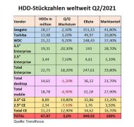 Festplattenmarkt Stückzahlen weltweit Q1/2021 (Quelle: Trendfocus)Trendwende im HDD-Markt: Im zweiten Quartal wurden weltweit rund 67 Millionen Festplatten ausgeliefert. Den Marktforschern von Trendfocus zufolge sei dies im Quartalsvergleich ein Anstieg um fünf Prozent. Insgesamt entspricht dies einer Gesamtkapazität von knapp 350 EByte.